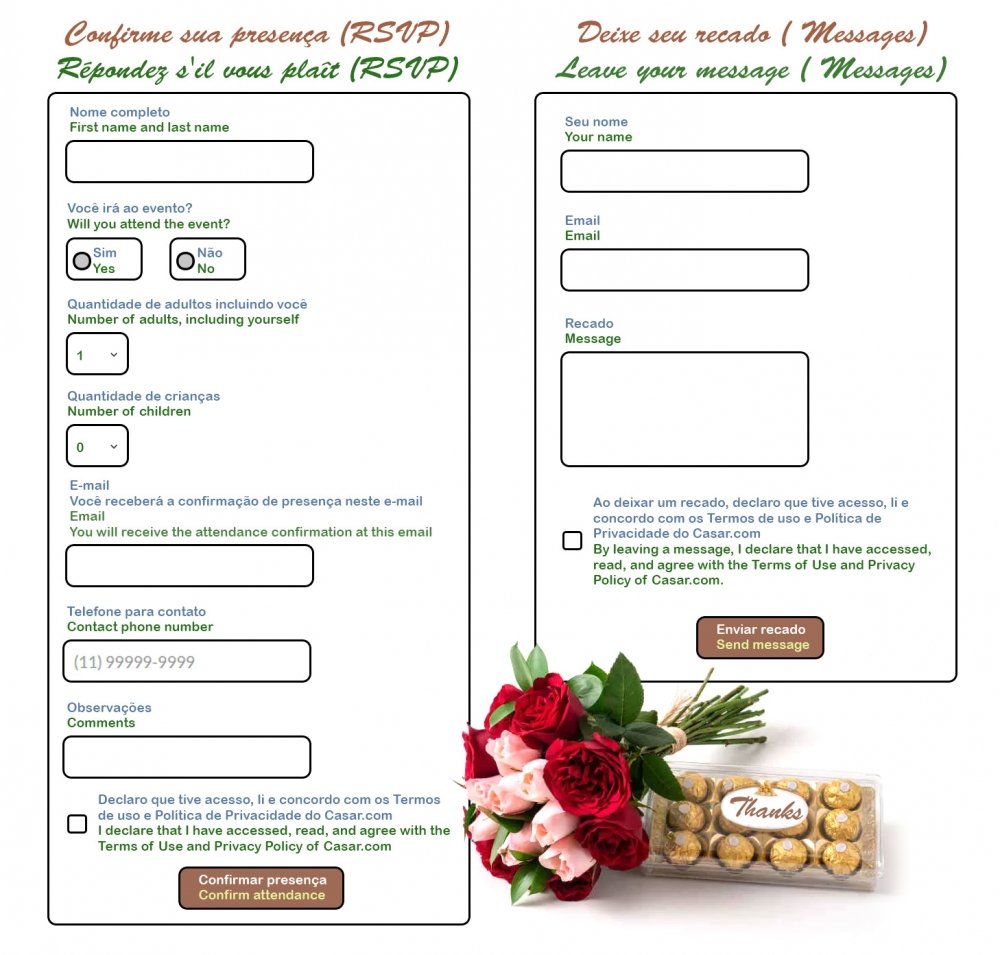 "Criamos este cantinho virtual para dividir com vocês a alegria imensa que estamos sentindo ao dar esse passo tão especial em nossas vidas. Estamos felizes por compartilhar esse novo capítulo de nossa historia, e mal podemos esperar para celebrar com todos vocês esse momento único que nos marcará da melhor forma para sempre! Obrigado por fazer parte desta nova jornada que estamos vivenciando!"